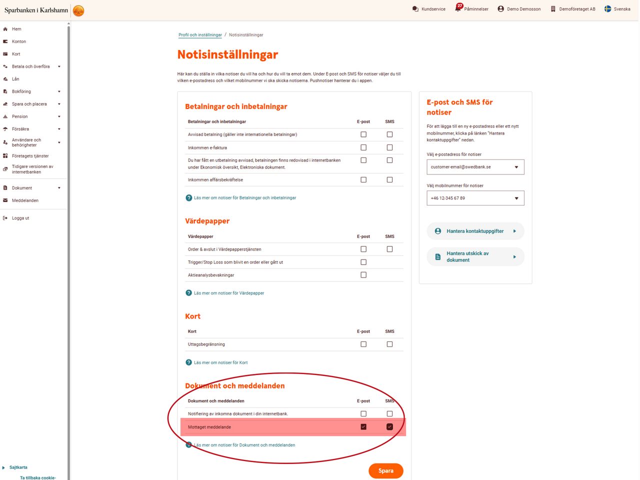 4. Längst ner på sidan under Dokument och meddelanden väljer du att klicka i hur du vill ta emot dina notiser för mottagna meddelanden, via mejl eller via sms. Vi rekommenderar att du väljer sms.