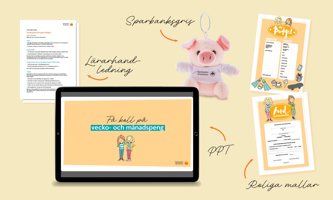 Materialet består av tidningen Lyckoslanten, en PowerPoint-presentation som ska visas för eleverna, samt en lärarhandledning där det framgår vad du som lärare kan prata om och vilka övningar ni kan göra tillsammans. Alla elever får dessutom en liten nyckelring med vår Sparbanksgris.
